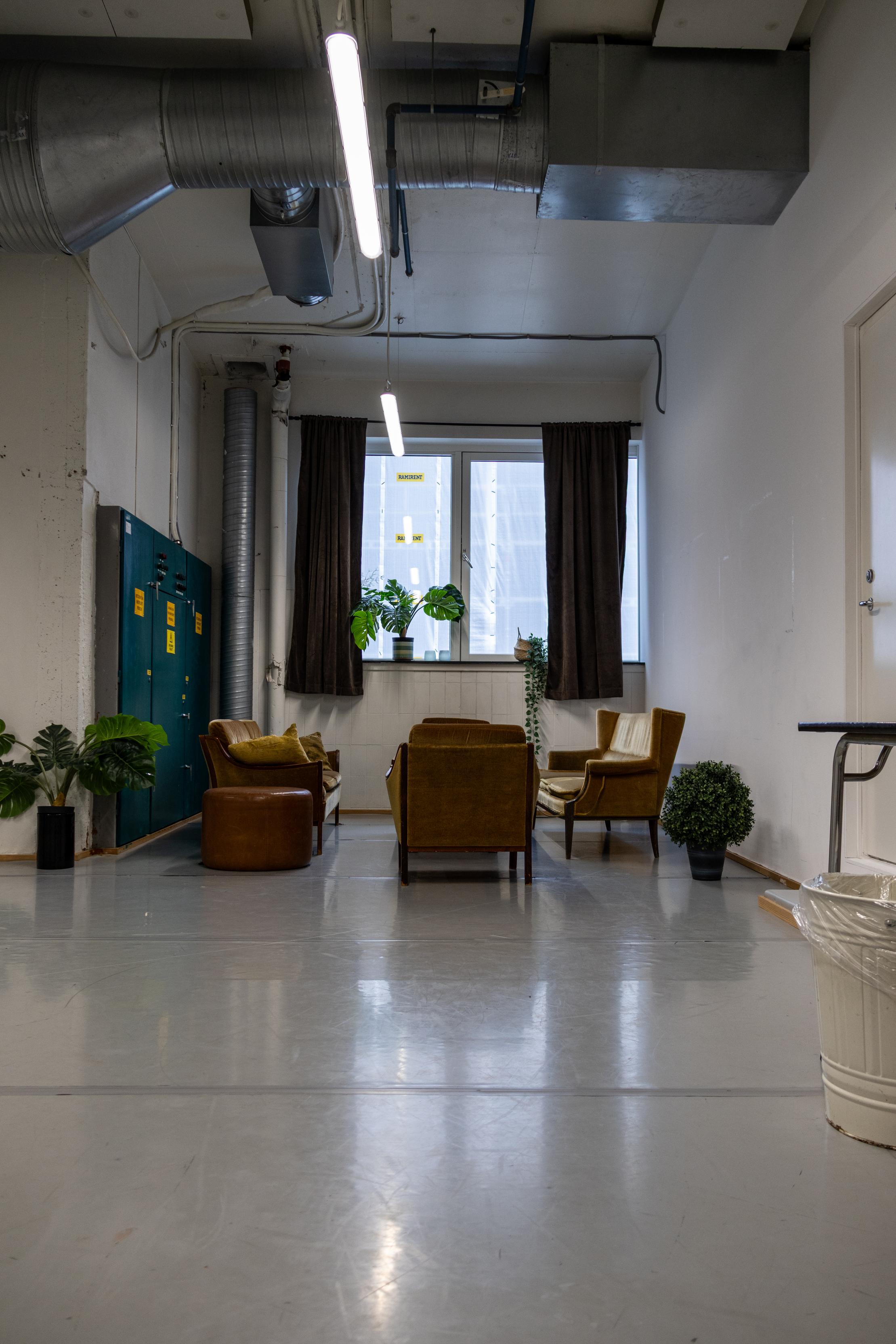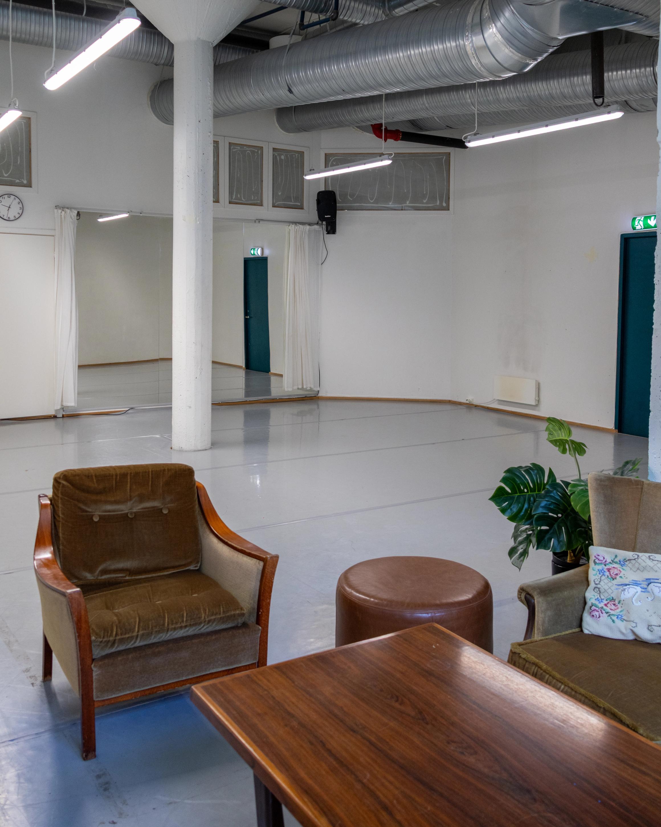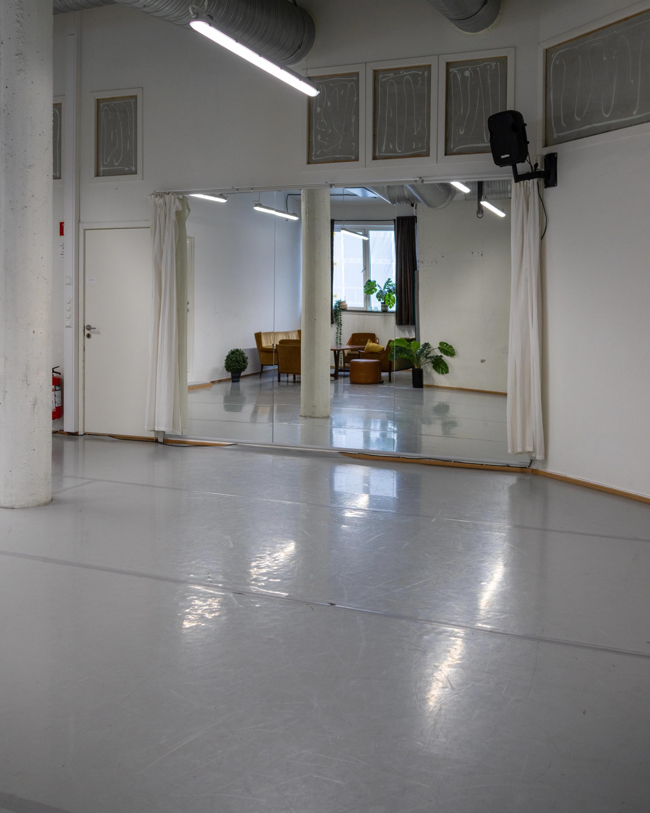 Lille Produksjonsrom er 65kvm og fungerer fint som både kontor og danserom i ett. Rommet har lydanlegg, og det er et speil på den ene kortveggen som kan dekkes til om ønskelig.